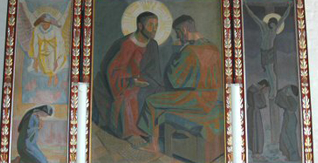 Da syddøren i kirken blev flyttet i 1922, blev den udvendigt udsmykket med et relief af kendte maler Joakim Skovgaard over fyldningen, indvendig er tympanonfeltets fresco udført af Niels Larsen Stevns. Joakim Skovgaard (1856-1933), billedkunstner, søn af P.C. Skovgaard, var en dansk billedkunstner, maler, billedhugger og kunsthåndværker, og stod blandt andet bag de fantastiske fresko-malerierne i Viborg Domkirke. |