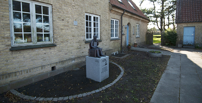 opsat en skulptur af forfatteren i baghaven, udført af kunstneren Bodil Dam. |